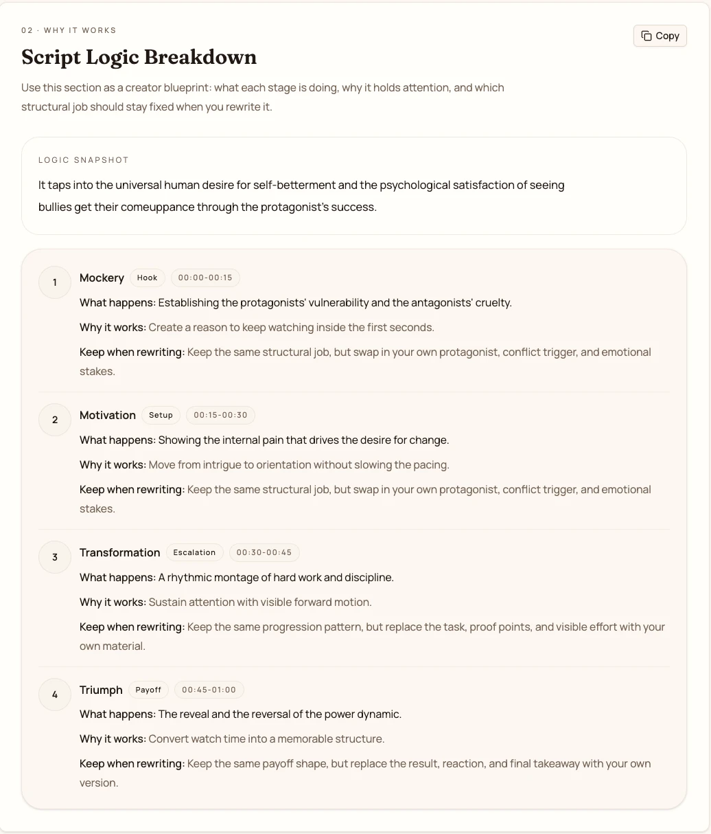 这不是一段普通总结。你会拿到来源视频上下文、精简的脚本逻辑拆解,以及可直接用于生成的最终复刻提示词。