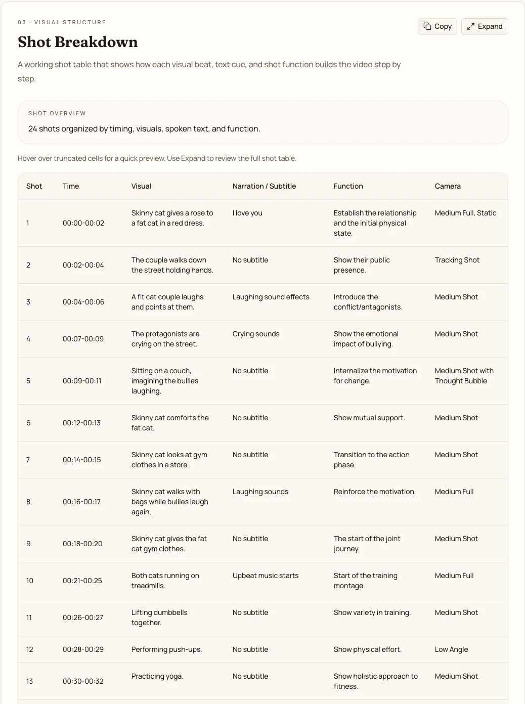按镜头查看时间、画面、字幕、镜头作用和机位处理,而不是只看到一段模糊总结。节奏、重复和升级关系都能在这个表里被快速看清。