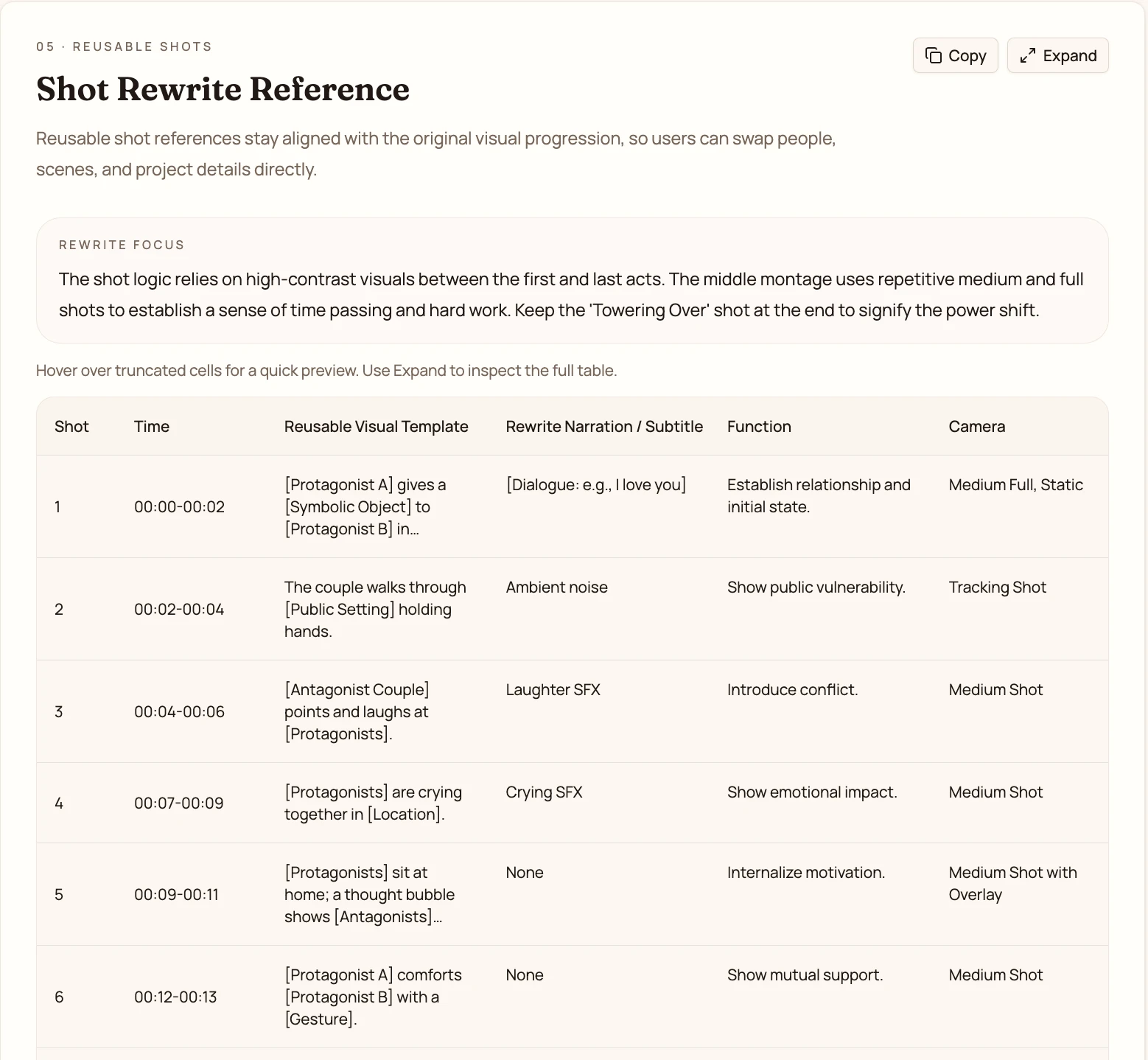 Open the full report for rewrite references, shot analysis, and the final recreate prompt in one focused workspace.